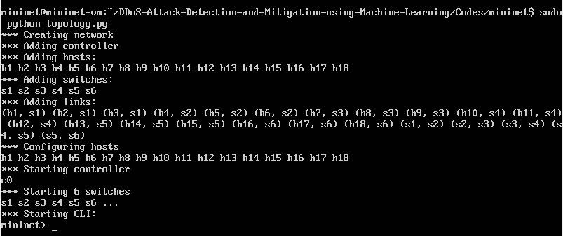 Here the topology is being created for DDoS attack with 18 hubs and 16 switches interconnected with the Mininet controllerforperformingDDoSattack.