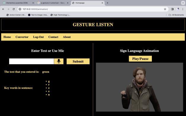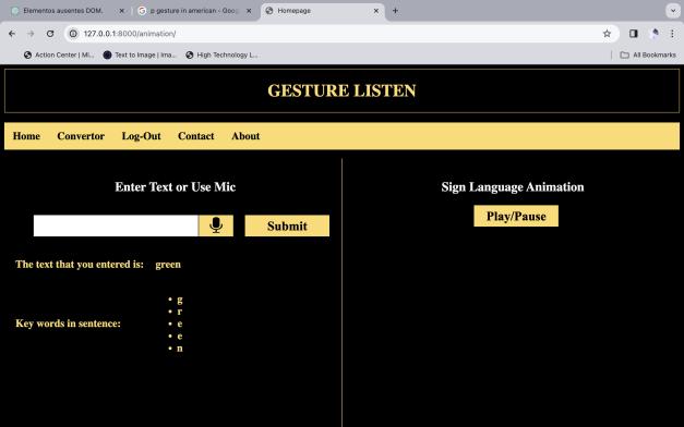 The development of the "Gesture Listen" application, which converts spoken language into Indian Sign Language (ISL) animations, represents a significant advancement in accessibility technology. Through extensive testing and user feedback, the application has demonstratedpromisingresultsinaccuratelytranscribing speech into text and generating corresponding ISL animations. However, challenges such as ensuring the accuracy of speech recognition in various accents and dialects, as well as optimizing the performance of the ISL animationsforsmoothplayback,wereencounteredduring thedevelopmentprocess.