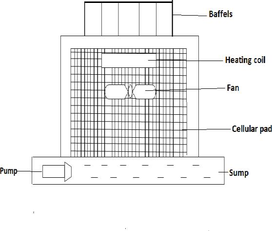 The process begins byactivatingthe pump to draw water fromthebottomtank,whichisthendirectedontostationary pads located behind two side doors via delivery pipes. Subsequently,theexhaustfaninitiates,drawingatmospheric air through the wet pads. Cooling occurs as the air comes intodirectcontactwithwaterparticles.Thisprocess,known ascompletecontactcooling,saturatestheairatitswet-bulb temperature, transferring sensible heat to water as latent heat.Withtime,theairbecomessufficientlycooledthrough