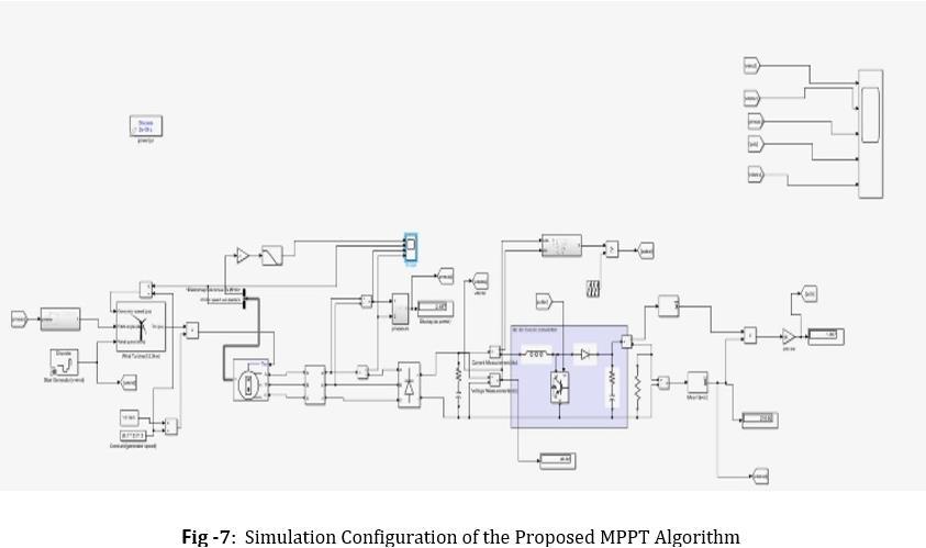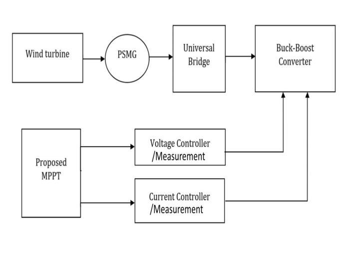 To validate the effectiveness of the proposed MPPT algorithm,thesimulationshavebeencarriedoutusingthe SIMULINK software. The simulation configuration of the proposed algorithm which consists of a wind turbine model,aPMSG,andaBuck-Boostconverterisconstructed as depicted in Fig.3. The PSMG Model, wind turbine model, and the proposed MPPT algorithm are implementedbyusingtheMATLABblocks.