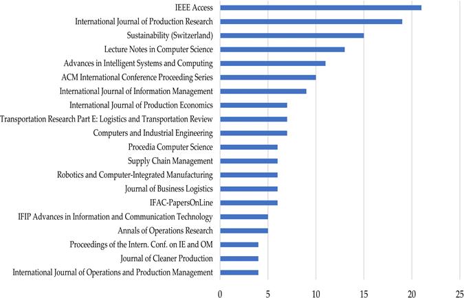 Journal publications are gradually replacing conference proceedings as the preferred method of publication (71% of all articles in 2017 vs. 29% in 2020), which bodes well for the topic's development & future prominence. We searched the literature set for instances of publications with substantially identical material, as occasionally scholars submit papers to conferences and then to journals, but we did not find any. By displaying just journalswithfourormorearticles,Figure14displaysthe journals with the greatest number of published papers. Other publications cover 153 stories as their only linked coverage, while sixteen other outlets cover three articles each.Figure 13analysisalreadyrevealstwointeresting& complementary topics of inquiry. There is one set of journals that focuses on business and engineering (e.g., International Journal of Production Economics, Supply Chain Management, and International Journal of Production Research) or another set that focuses on information systems research (e.g., IEEE Access, Lecture Notes in Computer Science, or International Journal of Information Management) and has nearly the same total numberofpublications.