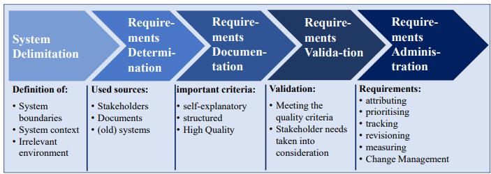 requirements of the stakeholders, documenting them correctly, checking & integrating them and managing the documented needs throughout the entire life cycle of the system". The procedures are shown in the illustration below.