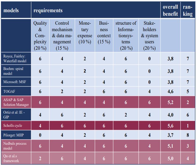 Usingtheestablishedcriteria,theutilityanalysisisapplied to assess the chosen integration models for IT technologies. For both qualitative & semi-quantitative multi-criteria decision issues, the utility analysis is a common tool to employ. In addition to being easily adaptable to unique instances, it aids in decreasing complexity. It is also easy to remove or re-insert specific components. [21] The needs for evaluation are defined in thefirststageofutilityanalysis.Everythinghasbeentaken care of. Phase two involves developing a target tree to prioritize evaluation criteria. Internal & external factors are the two primary types of requirements used for this purpose. Phase three involves defining potential requirements' features. To achieve this goal, we use a utility value scale to numerically assign values to the spoken response options. (As an example, if a need is reallytakenintoaccountinthemodel,itwouldbe6,andif it is not, it would be 0.) [21] Phase four involves creating partial utility values to assess each integration model in lightofthespecificneeds.Thefinalstepinvolvesusingthe weighting factors to get the total utility of each model. Plausibility & sensitivity analyses are used to verify the outcome. The last step is to determine the order of importance.Inordertohighlightthebestoptions,thetotal benefits are arranged in a certain order. [21] Figure 7 displays the top four models, namely Scholl's cycle, ASAP, Nedbal'sprocess,&Quetal.framework.