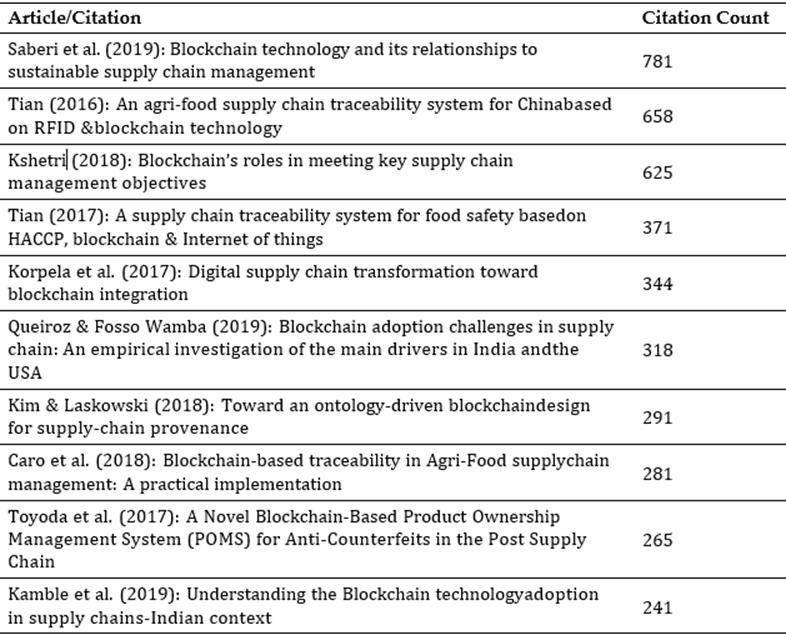 According to our research, more than a thousand writers worked on BCT studies in OM and SCM. Choi, T.-M. has writtenthirteenarticles,Li, Z.,&Huang,G.Q.havewritten seveneach,FossoWamba,S.haswrittensix,and Queiroz, M.M. has written five. Hong Kong Polytechnic University, The University of Hong Kong, Worcester Polytechnic Institute, TBS Business School, Chinese Academy of Sciences, and Hong Kong Polytechnic University are the topcontributinguniversities.SeeTable1forarundownof theliteratureset's10most-citedpapers.Thearticlesfrom various journals that focused on BCT and are part of this article's literature set include: International Journal of Production Economics ("Investigating supply chain structural dynamics: novel technologies that disrupt or disruption risks"), Robotics or Computer Integrated Manufacturing ("Blockchain technology in industry"), Computers or Industrial Engineering ("Blockchain or TokenizationforIndustry&Services").
