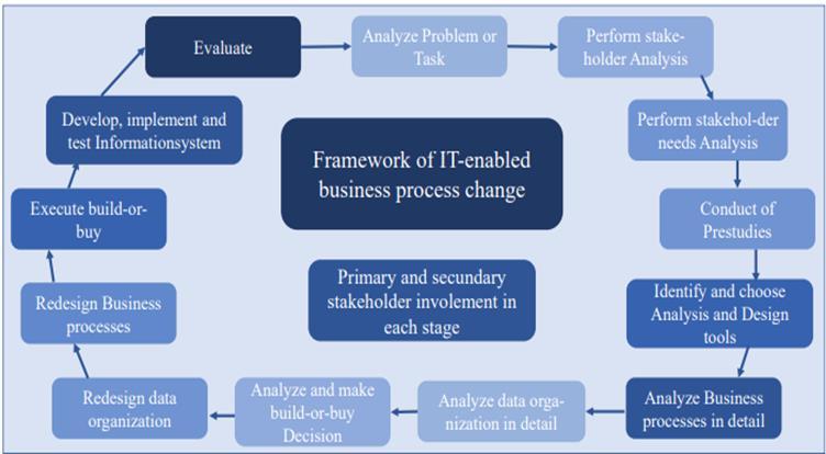 ThespiralmodelisthebasisofScholl'scycle.Theproblem and its associated duties are first specified. After that, we takeintoaccountthestakeholdersand whattheyrequire. After conducting preliminary research, the next step is to reorganizethecompany'sprocedures&dataorganization based on the findings. Following this, the information system is designed, implemented, & evaluated. Evaluation finishes the first run. Management &project team determine if another run is required. [11] The growth of this cycle is heavily dependent on stakeholders. The project team & stakeholders are able to gain a deeper understandingbyconcentratingonthisstakeholdergroup. [11].