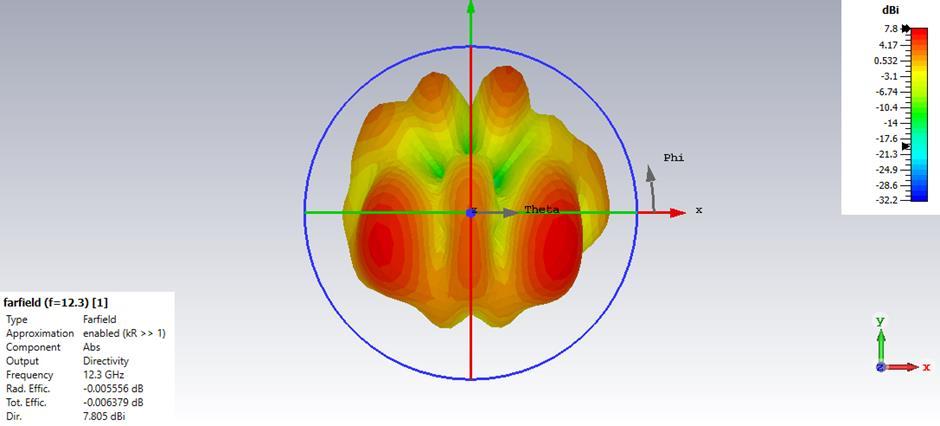 Thesuggestedantennaprovidesavisualrepresentationofits radiation pattern through a polar plot at the resonant frequency of 12.3GHz. Additionally, in Figure 9, we can observe the 2-D Cartesian radiation patterns at the same frequency. Furthermore, both Figure 10 and Figure 11 display the 2-D & 3-D radiation patterns at the antenna's resonant frequency of 12.3GHz. These radiation patterns reveal important characteristics, such as the main lobe's orientationat18.0degrees,anangularwidthof58.5degrees (3dB),andamainlobemagnitudeof3.15dBiatφ=90o.At thisresonantfrequencyof12.3GHz,theradiationefficacyis approximately0.007867dB,whilethedirectivitymeasures 3.004dBi.