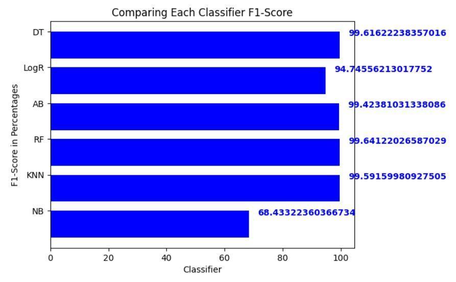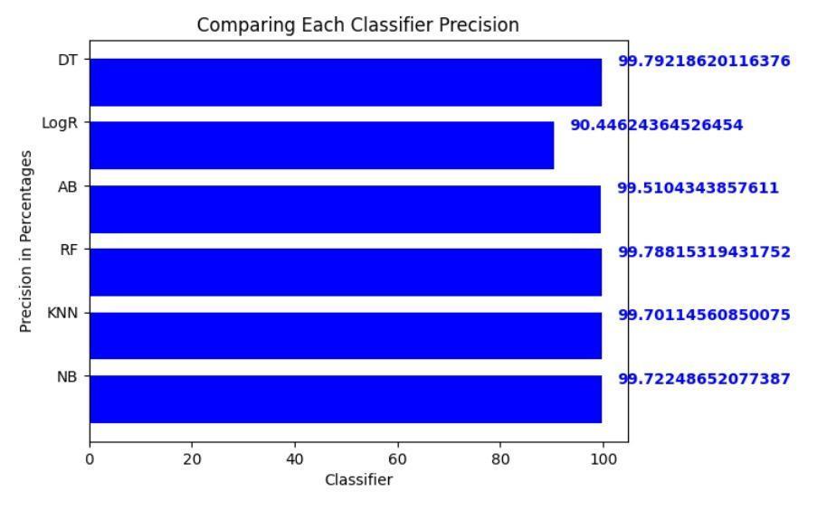 Whileothercontendersexhibitedrespectableperformance, none could dethrone Random Forest from its coveted position. Logistic Regression, for instance, clinched a commendableaccuracyof99.67%,showcasingitspotential asarobustalternative.However,itsslightlylowerprecision andrecallvaluescomparedtoRandomForestsuggestthatit might be less adept at capturing all anomalous instances [32].Similarly,DecisionTree,withanaccuracyof99.63%, displayedstrongcapabilities,butitsinherentsimplicitymay limititsabilitytounravelthecomplexitiesofcertainattack patterns.