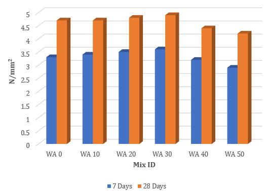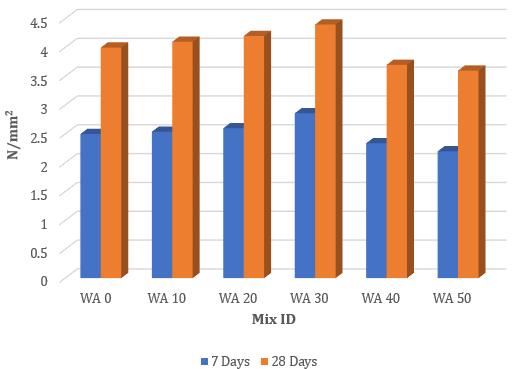 ratioof0.45ismaintainedacrossallmixtures.Theconcrete samples undergo compressive strength and split tensile strength evaluations after 7, 14, and 28 days of curing. Findingsindicatethattheoptimalstrengthisattainedwhen theconcretecontainsawoodashcontentbetween20%and 25%,surpassing the strength of both thestandard control concreteandothermixvariations.