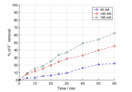 Theimpactoftheappliedelectriccurrentontheelimination of fluoride through EC treatment was evaluated. The experiments were performed under uniform conditions, withaninitialfluorideconcentrationof15mg·L-1andpH6. Three distinct currents (40 mA, 100 mA, 190 mA) were examinedtodeterminetheirefficacy.Thetotalanodicarea utilizedinthesetrialswasmeasuredat0.0076m2.