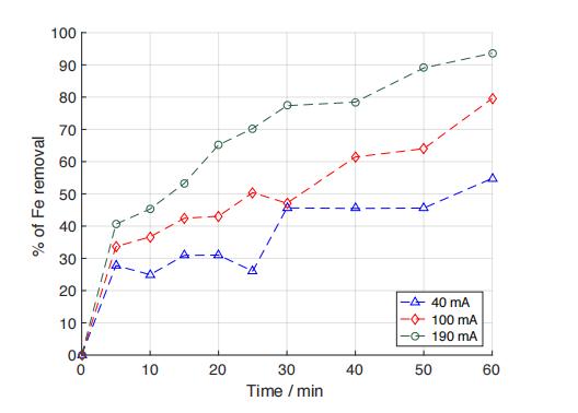 In order to ascertain the impact of the administered electrical current (I) on iron elimination during electrocoagulation (EC), all trials were performed with a startingconcentrationof25mg·L⁻¹andpHlevelat6.Three distinctelectriccurrents,namely40mA,100mA,and190 mA, were tested while maintaining a total anodic surface areaof0.0076m².