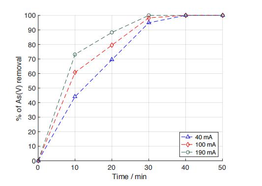 To ascertain the impact of the administered electrical currentonarsenic(V)eliminationthroughECexperiments, three distinct electric currents were utilized - 40 mA, 100 mAand190mA.ThetestswereconductedunderapHlevel of6withaninitialconcentrationofarsenic(V)at3mg·L-1. The total anodic area was measured to be approximately 0.0076m2.