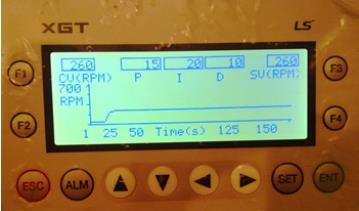 In addition, the speed can be adjusted by comparing the measured time with the P, I, D coefficients, and the set value and the current value are displayed on the HMI for monitoring purposes. For example, the engine speed for a 260-rpm setting is shown in figure 16. HMI function buttons are defined. If this function is not defined, this buttonwill notwork.F1,F2,F3,F4keypositionsareused for thedefined functions. The F1keyis settoincreasethe Kp value in steps of 10. The F2 key is set to increase the currentvaluein10steps