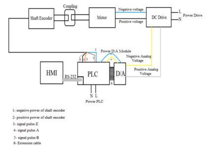 PLCisanimportantpartofthework.WeusePLCtocontrol motorspeed.Firstofall,themotorspeedissenttothePLC bytheshaftencoder,andthenthePLCgeneratesacontrol signalaccordingtotheprogramandPIDcontrollertoreach the desired speed. The analog signal of the D/A module is sent to the DC driver. When the control signal is received, the driver sends the required voltage to the motor. PLC receives the signal from the shaft encoder each time, PLC measuresthemotorspeedandproducesthesignaltoreach the highest speed in the shortest time and complete the process each time, the error is constant and low in the stable state. The HMI monitor displays the coefficients of thePIDcontrollerwiththedesiredspeedandmotorpower andplotsthemotorpoweragainsttime.Additionally,using the HMI buttons, this function can change the PID coefficientsanddesiredmotorspeed.ThePLCusedinthis projectisG7M-DR20UproducedbyLScompany.Onetype ofDCmotoristhepermanentmagnetDCmotor(PMDC).In this project, we use the MFA56VL model, which is a