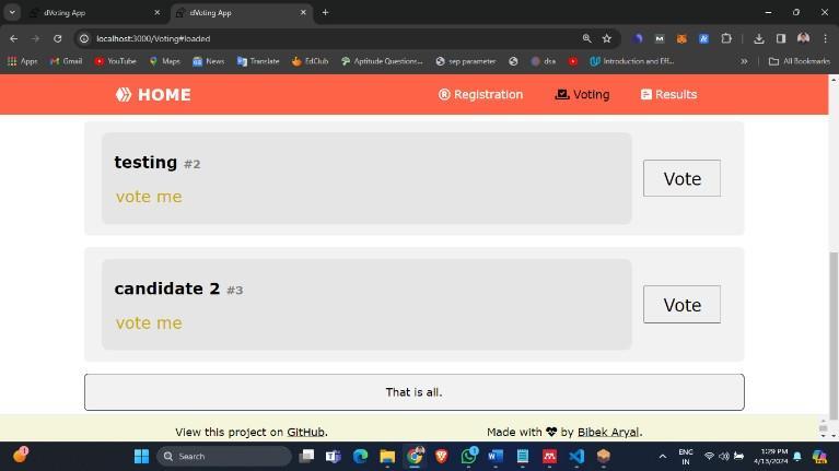 4.1.6 Testing the E-voting System: Simulate the voting process by sending transactions to the smart contract functions. These transactions will be recorded on the blockchain, and the smart contract will update its state accordingly. Verify that the smart contract accurately recordsvotesandupdatesthetally.Retrievevotingresults fromthesmartcontractanddisplaythemtousersthrough yourfrontendinterface.