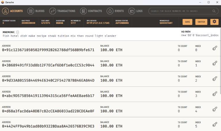 C. Ganache: As a personal blockchain designed for rapid Ethereum application development, Ganache is useful. As we create our e-voting DApp, Ganache serves as a local storage solution, giving us a comfortable environment to testandimproveourdecentralizedapplication.