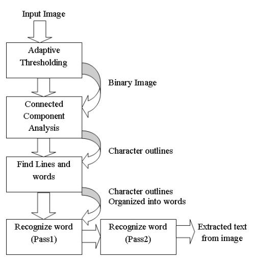 Theinputimageisthefirstpicturefromwhichyouwantto extractthetext.AdaptiveThresholding:Thisphasecreatesa binary picture from the supplied grayscale image. It is simpler to differentiate text from background in a binary imagesinceitsimplyhasblackandwhitepixels.Connected ComponentAnalysis:Inthiscase,theimageisexaminedto determineanddistinguishconnectedcomponents,whichare collections of black pixels that correspond to the text's letters.CharacterOutlines:Charactershapesarerefinedby creatingoutlinearoundtheconnectingcomponents.Locate LinesandWords:Theprogramlocatesanddividestextlines aswellasspecificwordsinsidethoselines.NametheWord (Pass1&2):Toprocessthedetectedwords,Tesseractusesa two-passrecognitionalgorithm.Itmakesanefforttoidentify eachwordseparatelyonthefirstpass.Highconfidenceword recognition is utilized to teach the OCR engine, increasing theaccuracyofthesecondrun.Inthesecondpass,Tesseract appliestheknowledgegainedfromthefirstruntoimprove its analysis of the remaining words. Extracted Text from Image: The output containing the identifiedtextisprovidedatthispoint.