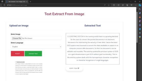 Tesseract OCR integration with Django for web application development constitutes the fundamental implementation phase. This includes creating strong functionsforlanguageselection,textextraction,andchatbot integration while combining the best features of both systems. In addition, language selection capability is designedtoimproveuserexperience byenablingusers to designatetheirpreferredlanguagefortextextraction.