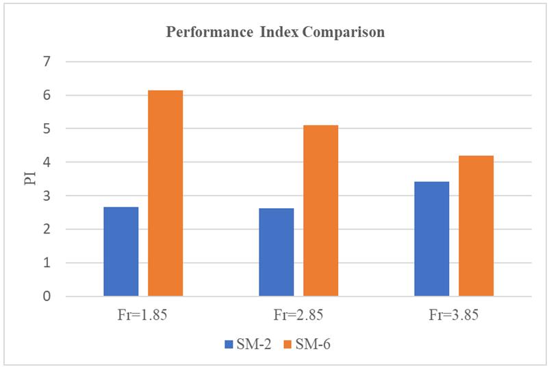 Where,Vistheaveragespeedofthechannel,dsdistanceof themaximumdepthofscourfromtheendsill,dmmaximum depthofscour,g-accelerationofgravity,sdensityofsand,ρw densityofwater,d50 theparticlesizedistributionsuchthat 50%ofthesandparticleisfinerthanthissize,ahighervalue oftheperformanceindexindicatesbetterperformanceofthe stilling basin model (Tiwari et al. 2022). The value of the performance index for different runs on each model for differentFroudenumbersisshowninTable3.