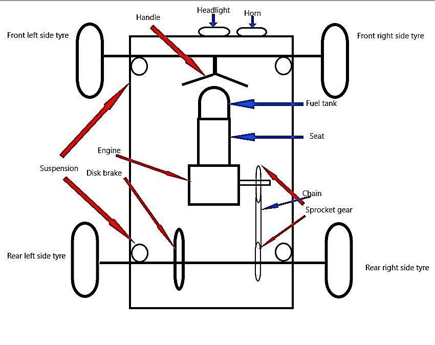 (d)Chassis:- Anall-terrainvehicle(ATV)chassisisthestructural framework that supports all other components of the ATV, including the engine, suspension, steering, and bodywork. Typically made from steel or aluminum, the chassis is designed to withstand rugged terrain and provide stability and durability during off-road adventures. It forms the backbone of the ATV, dictating its overall strength, weight distribution, and handling characteristics. ATV chassis designscanvarywidelydependingontheintendeduse,with some optimized for racing performance while others prioritize utility and versatility for recreational or work purposes.