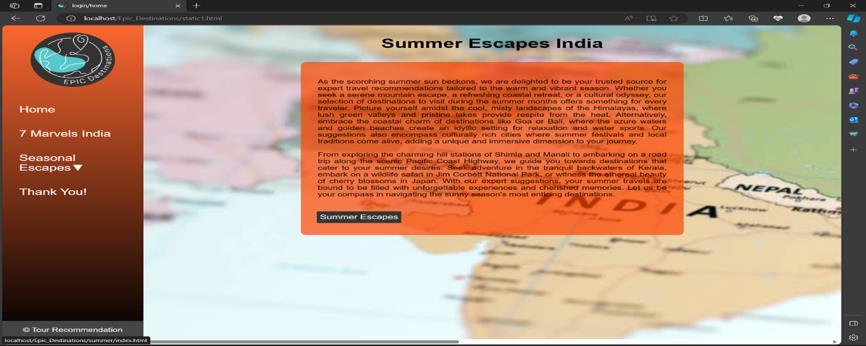 Intheinitialphaseofthework,wefocusedongatheringthe necessary requirements. We curated datasets, including "MarvelsIndia"and"SeasonalEscapes,"whichservedasthe foundation for our travel suggestions. Additionally, to enhance the visual aspect of the recommendations, we collected images from various sources using AI tools and internet resources. To support the development of our projectandensureitsrobustnessanduser-friendliness,we meticulouslyselectedthetoolsandtechnologiesnecessary.
