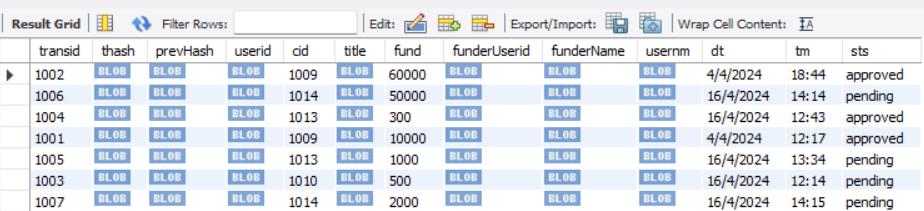 Each transaction hash value is linked with the previous transactionhashvalueandthathowthechainlikestructure is formed in database and blockchain structured block is createdhavingfieldastransid,thash,prevHash,userid,cid, title,fund,funderUserid,funderName,usernm,dt,tm,sts.