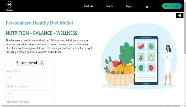 Butwedon'tstopthere.AtLEVELUP,wetranscendthe limitations of traditional e-commerce platforms by seamlessly integrating advanced machine learning capabilities[3,4].This integrationmarksasignificantstep forward, enabling us to provide highly personalized diet recommendationstailoredtotheuniqueneedsandgoalsof eachuser.Leveragingsophisticatedalgorithms,ourplatform meticulouslyanalysesuserdataandpreferences,allowingus togeneratecustomdietplans,recommendthemostsuitable fitness equipment, and even offer food suggestions complete withrecipes.Byharnessingthepowerofmachinelearning, LEVELUPensuresthateachuser'sjourneytowardsfitnessis notjustpersonalized,butoptimizedforsuccess[3,5].
