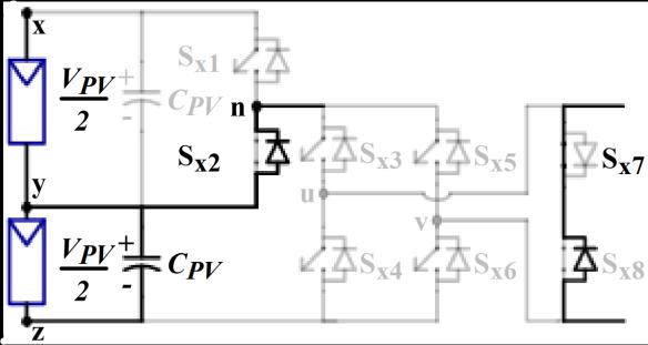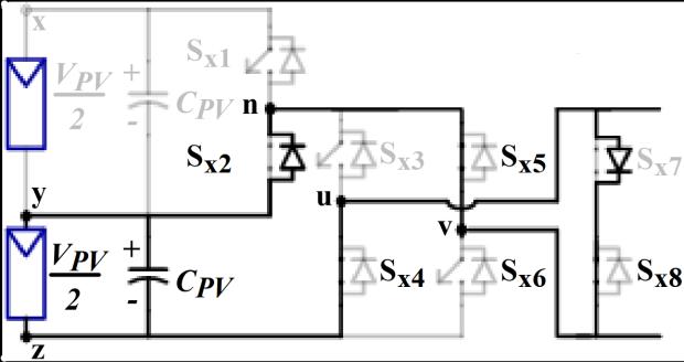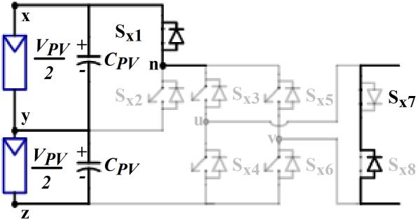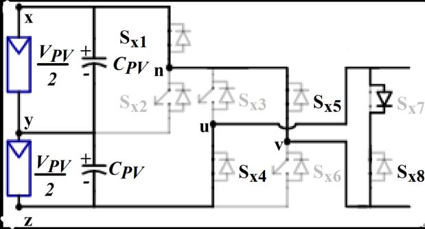 Figure1showstheschematiccircuitdesignofthefivelevel inverter that is suggested for the PV system. Two converters, Conv-1 and Conv-2, compose the provided setup.BothswitchesSx1 andSx2 combineupthehalf-bridge inverterknownasConv-1.Sx3–Sx8 arethesixswitchesthat togethermakeuptheConv-2'sinverterarrangement,which isbothefficient.OutofthesixswitchesinConv-2,anH-bridge circuitismadeupoffourofthem(Sx3 toSx6).InConv-2,the othertwoswitches,Sx7 andSx8,maybeturnedonandoffin both directions. The Conv-1's switches are responsible for producingtheVPV and0.5VPV voltagelevels.