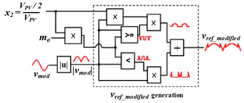 AsshowninFigure4,aunittriangularcarrierwaveform multipliedbyratiox2 willproducethenecessarytriangular wave.Theoutputvoltagereachesthelevelof'VPV/2'when theinstantaneousmagnitudeof'vref_modified'isgreaterthanthe magnitudeofthecarrierwave,insidethepositivehalfcycle andforphaseanglesrangingfrom0to30degreesor150to 180 degrees. To keep the fundamental output voltage's