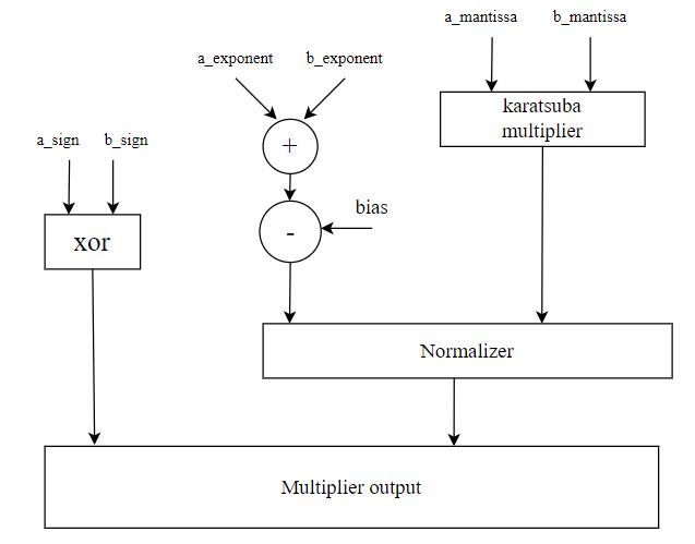 Thefloating-pointKaratsubamultiplieraddressesthisissue by breaking down the multiplication process into smaller sub-problems. It recursively divides the original floatingpoint numbers into smaller parts and performs multiplicationsontheseparts.Theseintermediateresultsare then combined to obtain the final product as shown in Figure5