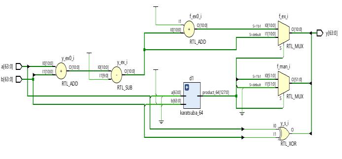 The schematic and simulation results of double precision floating point multiplier using karatsuba multiplier are showninFig-12andFig-13respectively.