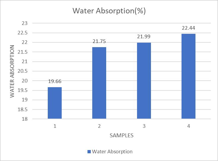 Thewaterabsorptiontestofconventionalbrickisdonefor comparison. The dry weight of the conventional brick is 2039gandthewetweightis2538g.Thewaterabsorptionof conventional brick is 19.66%. For mix with 10% sewage sludge, the minimum water absorption is shown by brick with 1% iron tailings For the mix with 15% sludge, the minimumisshownbythebrickwith1%irontailings.Forthe mix with 25% sludge, the minimum water absorption is shownbybrickwith1%irontailings.Whenthesludgecontent increasesthewaterabsorptionalsoincreases.TheMixwith 25%showsthemaximumwaterabsorption.Also,increasein theamountofirontailingsincreasethewaterabsorptionof bricks.Thus,waterabsorptionislessforbrickswith1%iron filings.Thegraphicalrepresentationofwaterabsorptionis givenbelow.