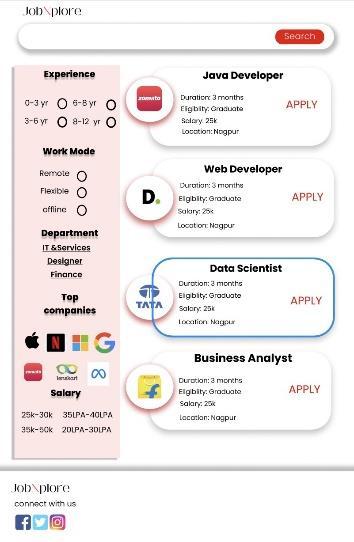 4. Job Suggestions: The application will analyze theuser’spreferences,skills,andotherrelevant factors.Basedonthisinformation,itwillsuggest relevantjoblistingstotheuser.