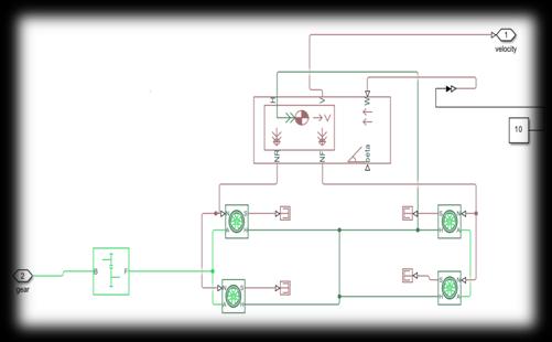 Figure.5.4showsthesimulationofthedrivetrainsystemof the vehicle. The component group delivering power for driving vehicle corresponds to the vehicle. It consists of a vehicle frame and a drive wheel. The model is developed withafour-wheel-drivesystem.Atthefrontandrear,two wheelsareplaced.Adrivewheelisavehicle'swheel,which transmitsforceandtransformstorqueastractiveforcefrom tirestoroad,causingvehicletomoveforward.