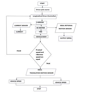 Theflowchartoftheelectricvehiclemodellingisshownin Figure 5.1. The drive cycle source consists of throttle and brake pedal input. The longitudinal driver controller receives the input from the drive cycle source. The driver controllerhasthreeinput,namely,referencespeed,velocity feedback, and grade and three output ports, namely info,