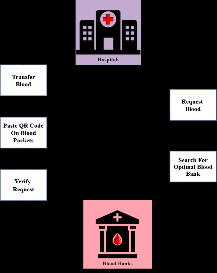 When a hospital requires blood, they specify the desired bloodgroupandprovidethepatient'sAadhaarnumberfor accountability purposes, ensuring transparency and preventing fraudulent behavior such as black-market blood sales. An algorithm then determines the most optimalbloodbankbasedonfactorssuchasproximityand quantityofavailableblood.Oncetheoptimalbloodbankis identified, the required blood is transferred from that bloodbank totherequestinghospital.Uponreceiptofthe blood, the hospital can virtually access detailed information about the blood received, including its origin and status. Additionally, they can view the location of the blood bank on Google Maps for further verification. The physicalverificationofthereceivedbloodiscompletedby scanning the QR code attached to the blood packets, thus ensuringthecorrectnessofthereceivedblood.