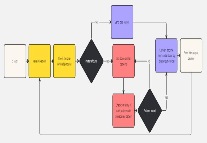 Initially,duringthetimeofreceptionofapattern, thealgorithm,firstofall,itchecksifitmatcheswithanyof thepre-definedpatterns.Ifnot,thenitfindsasetofafew patternswhichmatchesaccordingtoit.Itisarrangedina way that the most matching will be at top and the least matchingwillbeatbottom.Thosepatternsalongwiththe receivedpatternaresenttoafunctioninwhichthepatterns arecomparedwiththehelpofthealgorithmtocheckwhich pattern matches more with the received pattern. The resultedpatternsareagainsenttothesamefunctiontofilter thebestpattern.Theaccuracycanbeincreasedbyiterating thepatternsmultipletimesuntilwefindthemostacceptable solution.