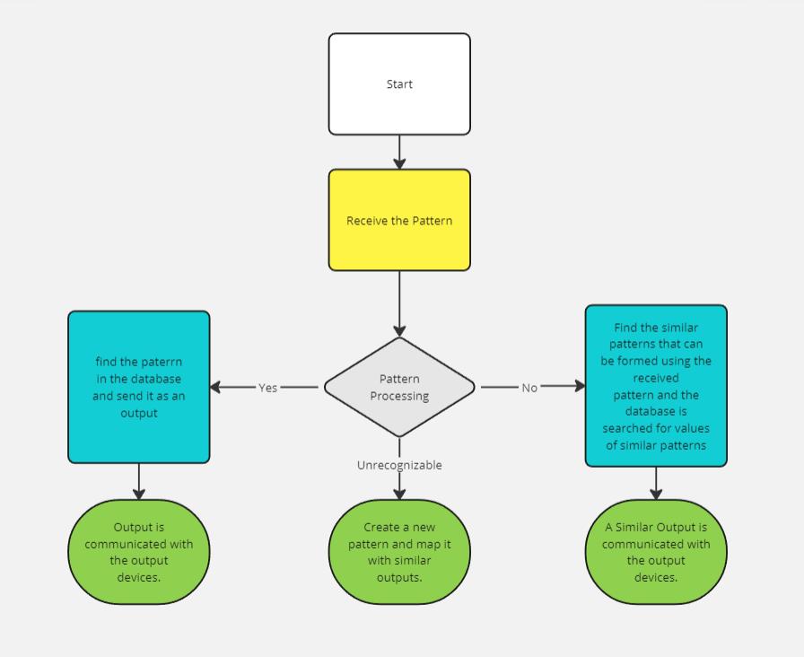 Thealgorithmalreadyhasasetofpredefinedvalues totrainthealgorithm.Ifthepatternformedbythesensors aresimilartoaparticularvalue,thenanoutputisprovided. Butifthevaluesthatdidn’tmatch,thecontrollersearches forthesimilarvaluesandseesifitcanmapthepatternto any available data in the controller. If a pattern which is totallyunrecognizableisidentified,thencontrollermayread the new pattern and try to develop a similar output by comparingitwiththeotheroutputswhicharealreadyused intrainingthealgorithm.