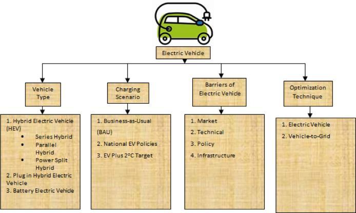 We haveresearched theseveral kindsof electriccarsthat are now on the road worldwide. In addition, we have identified the obstacles facing EVs in the Indian market. Additionallycoveredareseveraloptimisingstrategies.Fig.1 presents the comprehensive overview of electric vehicles thatwasexamined.Thisessayisdividedintomanysections, including:TheprocessisexplainedinSection2.Asummary of all the different configurations for electric vehicles is provided in Section 3, and then in Sections 4 and 5, the chargingscenarioandtheelectriccarbarrierarediscussed. InSection6,theEVandV2Goptimisationapproachisgiven, andinSection7,itisconcluded.