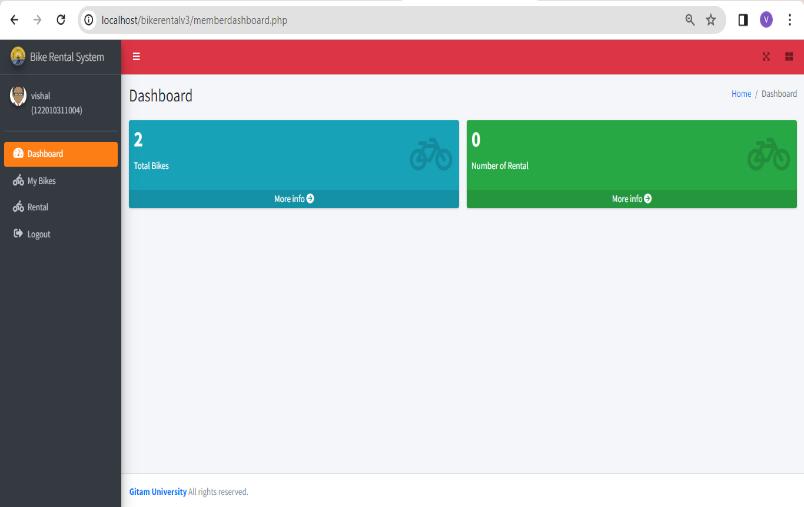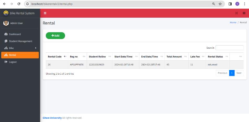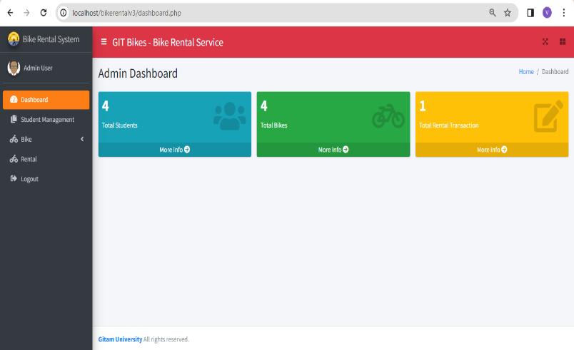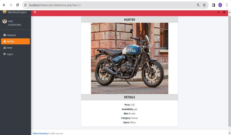The creation of the Bike Rental Application, which is specifically developed for GITAM University Students, representsabigstepforwardin transportationsolutions.By addressing students' concerns about bike rentals, accountability, security, and administrative administration, this initiative has created the groundwork for a more efficient,secure,anduser-centricsystem.