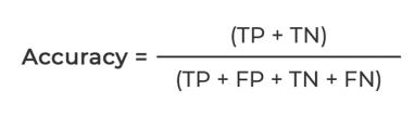 Accuracy: The accuracy of a classification model is calculatedastheratioofthesumofTruePositives(TP)and True Negatives (TN) to the total number of predictions made,whichincludesTruePositives,TrueNegatives,False Positives(FP),andFalseNegatives(FN).Mathematically,it canberepresentedas: