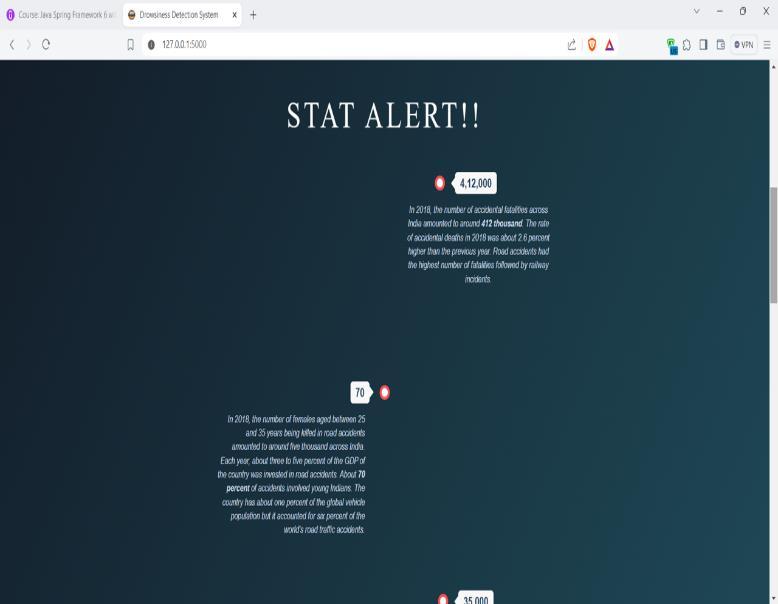 On the homepage given in Figure 2, visitors will find a carefullycuratedlistofinformativealertmessagesaimedat promoting road safety awareness. Additionally, the site provides an in-depth statistical analysis of road accidents, offeringvaluableinsightsintotrendsandpatternsobserved in various countries, thus fostering a deeper understanding ofroadsafetyissuesonaglobalscale