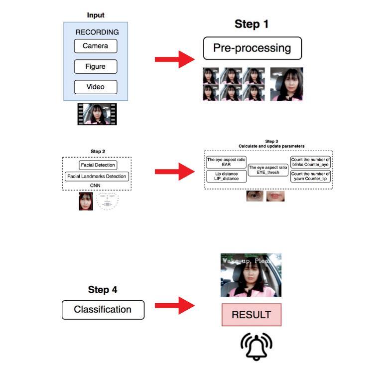 Figure 1 illustrates the systematic process of the driver drowsiness detection system. It begins with capturing video footage using a camera, followed by pre-processing to enhance image clarity through adjustments in contrast and brightness. Subsequently, facial detection algorithms are employed to identify facial landmarks such as eye corners, mouth, and nose, which are crucial for assessing drowsiness. The system calculates the Eye Aspect Ratio (EAR)tomeasurethedegreeofdrowsinessandtheMouth AspectRatio(MAR)todetectyawning,anadditionalsignof drowsiness.UtilizingpredefinedthresholdsforEARandlip distance, if either falls below or exceeds the threshold, respectively, the system classifies the driver as drowsy. Finally, based on the extracted facial features, the system outputs a classification between "drowsy" and "not drowsy," enablingtimelyinterventiontopreventpotential accidentsandensureroadsafety