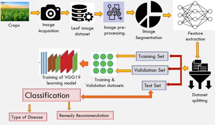 We use VGG19 deep-learning neural network with 19 Connection layers, including 16 convolution layers and 3 fullyconnectedlayerstolearnfeaturesfromtheimagesand classifythemintodiseasecategories.