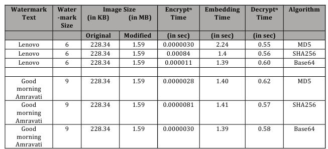 Explanation: Thesizeofawatermarkandtheencryption algorithmuseddonotaffectthemodifiedsizeofanimage. Regardless of these factors, the resulting image size remains consistent. The encryption time, extraction time, and embedding time are not solely determined by the speed of the algorithm itself, but also rely on factors such as system configuration, hardware performance, software implementation efficiency, image size and the computational complexity of the algorithm. Decryption time, or the time taken for extraction, can also be influenced by the size of the image. Larger images may require more computational resources and processing timetoextractinformationfrom,potentiallyincreasingthe decryption time compared to smaller images but not only depends upon size but also depends on a combination of factors, including image size, algorithm complexity, hardware performance, software efficiency, and I/O operations.