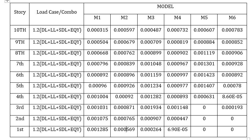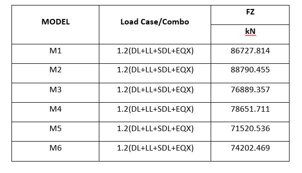 Values of lateral displacement, axial force, shear force, bendingmoment,storeydriftandbaseshearforzoneV,for load combinations 1.2DL+1.2LL+1.2SDL+1.2EQX along X direction for Six different cases will be analyzed and summarizednexttothisproject.