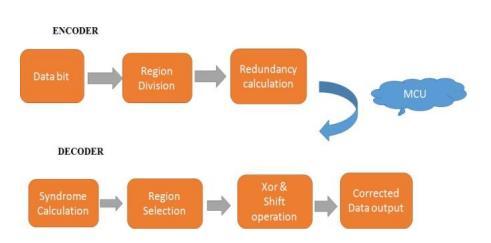 This work suggests a novel error correction algorithm (ECC) to lessen data corruption in volatile memory systems.XilinxVivido,whichwasbuiltinVerilogHDL,was usedtosimulateandsynthesizethesuggesteddesign.The amount of energy used to encode and decode process is, respectively, 0.167W and 0.127W. In contrast to established techniques, this encoding-decoding procedure uses less power and requires less space and time. This method will also be expanded in order to lower the area, latency,andpowerusage.Incomparisontootherexisting approaches, the decoder area rises since the zones were specifically chosen. Using the advanced region selection criteriafurtherreducesthis.