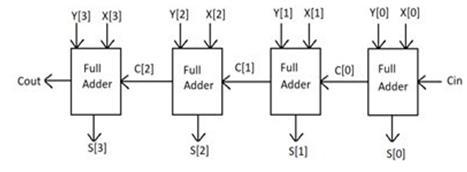 To provide the results of an addition operation on ann-bitbinarysequence,amultipliernumberoffulladders areplaced.Itcontinuesuntilitreachesthefinalstage,using the carryoutputof the previous adder asthe input forthe subsequent Full adder stage. The four bit (RCA) Ripple CarryAdderisshowninFig.2.