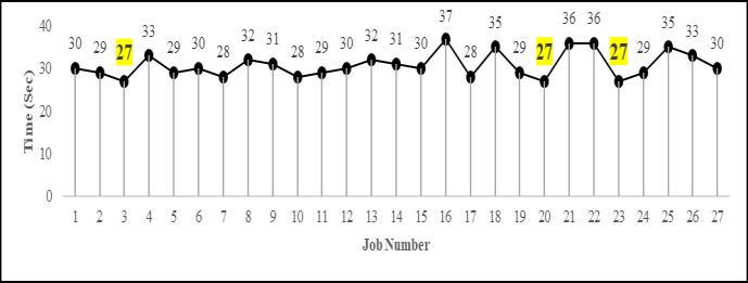 To improve the productivity on laser cutting machine,itisnecessarythatproductiontimeshouldbeas lessaspossible.Frommeasureddataofproductiontimeon 27jobs,minimumtimewasobtainedforjobnumberofdata set3,20and23