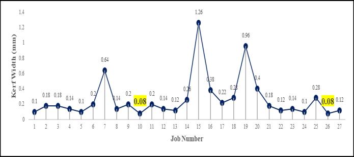 kerfwidthfor27jobs,minimumkerfwidthwasgenerated forjobnumber10and26havingvalueof0.08mm.