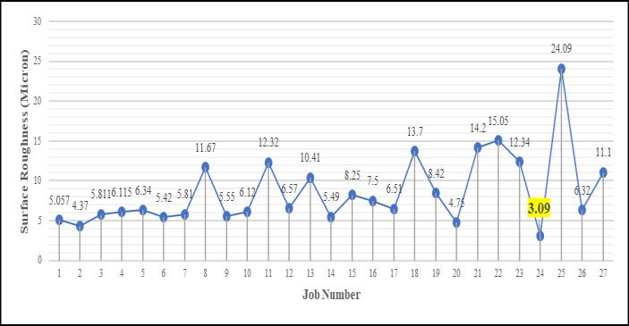 After making a job on laser cutting machine, it is necessary that it provides the smoother surface i.e. jobs havinglowersurfaceroughnessvalueforbetterfinishingofa product. From measured data of surface roughness for 27 jobs,minimumroughnesswasobtainedforjobnumber24 with3.090micron.